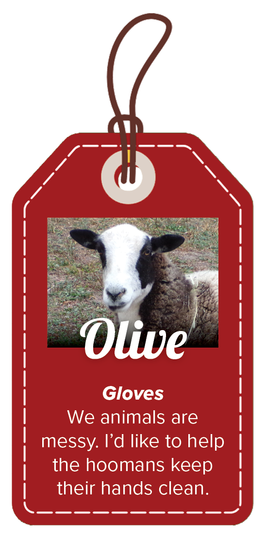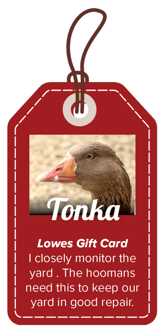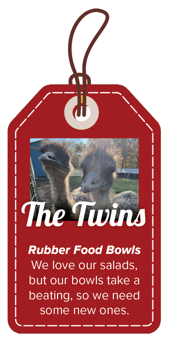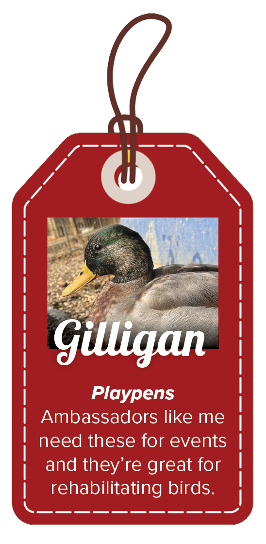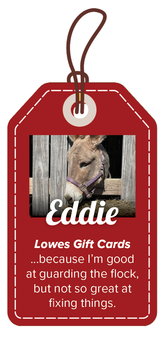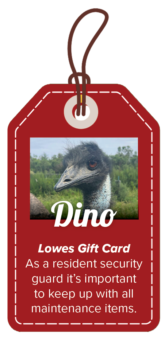 Some of our residents, who see everything that happens at the rescue and know what we need better than anyone, have crafted their own holiday wishlists. Click on their Holiday Wish Tags to peek at what they’re hoping to gift back to the rescue this season.